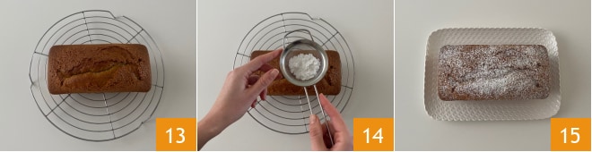 Depois, desenforme sobre uma grade 13 e decore o bolo com açúcar de confeiteiro 14 antes de servir 15.