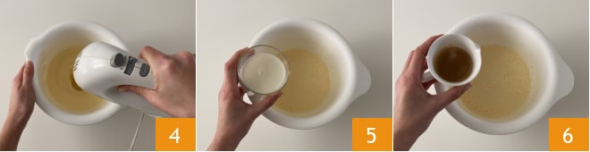 e bata por mais alguns instantes com a batedeira 4. Em seguida, adicione o leite 5 e o café em temperatura ambiente 6.