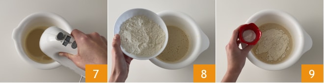 Bata por mais alguns instantes com a batedeira 7. Incorpore a farinha 8 e o fermento 9 de uma só vez.