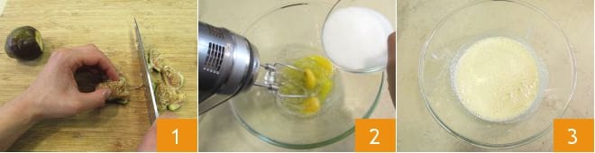 Para preparar o bolo inglês de figos e nozes, primeiro derreta a manteiga em uma panela. Lave os figos e retire as extremidades, depois corte-os grosseiramente em pedaços sem remover a casca 1. Coloque os ovos em uma tigela grande e bata-os com a batedeira elétrica, adicionando gradualmente o açúcar 2 até obter uma mistura espumosa e homogênea 3.