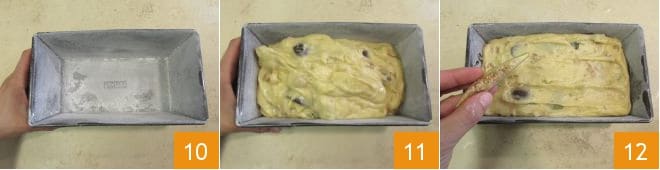 Neste ponto, unte e enfarinhe uma forma de bolo inglês de 20x11 cm e despeje dentro a mistura obtida 11. Nivele a superfície com as costas de uma colher levemente umedecida com água e coloque as fatias de figo que você já cortou 12.