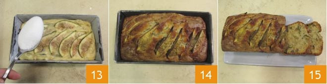 Por fim, polvilhe com o açúcar cristal 13 e asse em forno estático pré-aquecido a 180°C por cerca de 60 minutos. Uma vez assado, retire o seu bolo inglês de figos e nozes do forno 14 e deixe esfriar antes de removê-lo da forma e servir cortado em fatias 15!