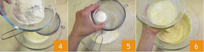 Peneire a farinha 4 e o fermento 5 dentro da tigela, depois misture com uma espátula e adicione também a manteiga derretida 6.