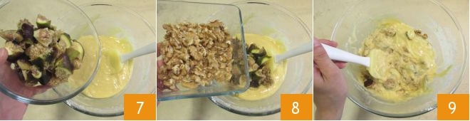 Adicione os figos 7 e as nozes 8 e misture novamente para incorporar tudo 9.