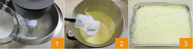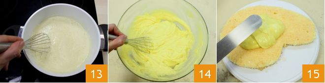 Coloque tudo de volta no fogo e leve à fervura, mexendo frequentemente 13; deixe ferver em fogo baixo por alguns minutos para que a mistura engrosse, continuando a bater com o batedor para evitar a formação de grumos. Agora pegue o meio copo de leite frio reservado e adicione em fio ao creme de confeiteiro, mexendo de vez em quando. Desligue o fogo e deixe esfriar cobrindo o creme com filme plástico em contato. Quando estiver frio, misture com um batedor 14 e depois distribua sobre uma camada de pão de ló 15.