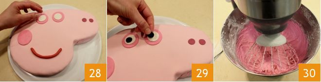 Cole também o nariz, a boca e o branco dos olhos 28, finalize com as pupilas 29. Dedique-se ao glacê real: na tigela da batedeira, trabalhe a clara e o açúcar de confeiteiro e adicione aos poucos os corantes alimentares para obter o tom certo de rosa escuro 30.