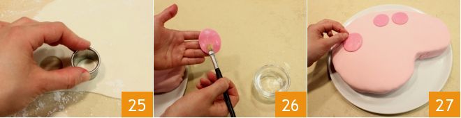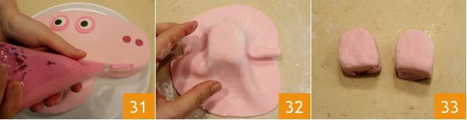 Coloque o glacê em um saco de confeitar com bico oblíquo e faça a borda do focinho e do nariz da Peppa Pig 31. Depois recheie as orelhas com creme de confeiteiro ou com geleia de damasco, então cubra-as com a pdz rosa eliminando as partes em excesso (32-33).