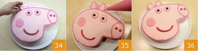 Coloque as orelhas perto da cabeça da Peppa Pig 34 e decore-as com o glacê 35 como no resto do focinho. Seu bolo da Peppa Pig está pronto para ser devorado 36!
