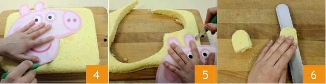 Retire o pão de ló, deixe esfriar e depois desenforme sobre uma tábua de madeira. Agora faça o download do molde da Peppa Pig clicando aqui. Com uma faca, corte o pão de ló seguindo o contorno do rosto 4 e aparte também recorte as orelhas 5. Divida as orelhas em duas camadas 6.