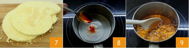 Divida também o contorno 7; à parte, prepare a calda: em uma panela leve à fervura a água, o açúcar e algumas gotas de aroma de tangerina, mexendo com uma colher de pau (8-9).