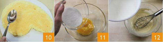 Com a calda, umedeça todas as camadas do pão de ló. Em seguida, prepare o creme de confeiteiro: em uma caçarola, aqueça o leite (reservando cerca de meio copo) com as sementes da fava de baunilha; leve tudo a uma leve ebulição, então retire a caçarola do fogo e deixe a baunilha em infusão no leite por cerca de 10 minutos. Em uma tigela à parte, bata as gemas com o açúcar 11 usando uma batedeira elétrica para obter um creme espumoso e esbranquiçado; continue batendo e adicione um terço do leite morno da caçarola em fio 12. Neste ponto, incorpore a farinha peneirada, adicionando-a aos poucos. Remova a fava de baunilha restante no leite e despeje a mistura de ovos, farinha, açúcar e leite na mesma caçarola.