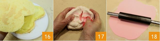 Faça coincidir perfeitamente o outro disco de pão de ló sobre a camada de creme 16, depois pincele a superfície com geleia de damasco. Em seguida, dedique-se à pasta de açúcar: coloque a gelatina de molho em água fria para amolecê-la; aqueça a glicose (ou mel) em uma panela de fundo grosso junto com a água, sem deixar ferver; esprema a gelatina e adicione-a ao xarope com a glicose. Agora peneire o açúcar de confeiteiro em uma tigela e adicione a glicose e a glicerina e amasse até absorver completamente o açúcar de confeiteiro. Transfira a massa para uma superfície polvilhada com açúcar de confeiteiro e continue trabalhando até que esteja lisa e homogênea e não grude mais nas mãos. Neste ponto, usando luvas descartáveis, tinja 2/3 da pasta de açúcar com corante rosa 17; trabalhe o bloco até que o corante seja absorvido e a cor esteja uniforme; estenda a pdz rosa em uma camada fina de poucos milímetros com um rolo 18.