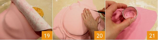 Coloque-a sobre o contorno da Peppa Pig com a ajuda do rolo 19 (para esta operação você pode consultar o guia: como cobrir um bolo com pasta de açúcar); faça aderir perfeitamente as bordas e a superfície, depois recorte e reserve as partes em excesso 20. Reserve um pequeno pedaço de pdz branca para os olhos; adicione mais corante a uma porção de pdz para criar a bochecha e a parte inferior dos olhos em um rosa intenso: você pode fazer a bochecha formando um disco com uma faquinha enquanto para a parte inferior dos olhos um cortador de 4 cm de diâmetro 21.
