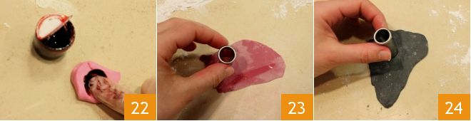 Misture corante roxo em um pequeno pedaço de pdz 22 para fazer o nariz, criando dois discos com um cortador de 1 cm de diâmetro 23, depois adicione corante preto a um pedaço de pdz branca para as pupilas, obtidas também com um cortador de 1 cm de diâmetro 24.
