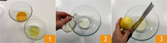 Para preparar o bolo sanduíche com creme de mascarpone, separe as gemas das claras. Em uma tigela, misture leite e óleo 2, depois rale a casca do limão 3.