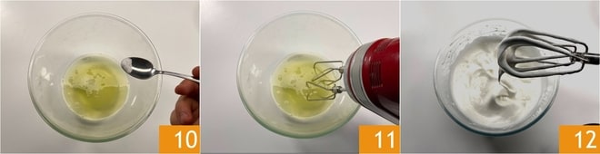 Incorpore o sal 10, depois bata com a batedeira elétrica 11 até obter uma mistura suave e espumosa 12.