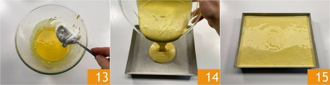 Despeje algumas colheres da mistura batida para suavizar a primeira massa 13, depois incorpore delicadamente o restante. Transfira a massa para uma assadeira de 30x20 cm untada e enfarinhada 14 15 e asse em forno estático pré-aquecido a 160°C por cerca de 30 minutos.