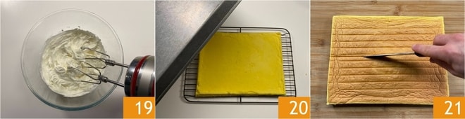 Bata o creme com a batedeira elétrica 19. Agora desenforme a base sobre uma grade 20, primeiro passando o dorso de uma faca na borda para soltar mais facilmente a massa. Vire o bolo sobre uma folha de papel manteiga, nivele as bordas e divida ao meio 21.