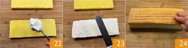 Espalhe o creme em uma das metades 22. Nivele cuidadosamente com uma espátula 23 e então coloque o segundo retângulo por cima 24.