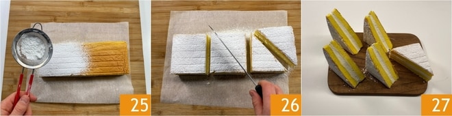 Polvilhe com açúcar de confeiteiro 25 e divida primeiro em 3 quadrados (de 9 cm cada) e depois novamente ao meio, obtendo assim 6 triângulos 26. O bolo sanduíche com creme de mascarpone está pronto 27!