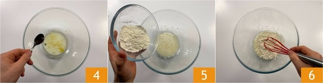 Adicione também o extrato de baunilha 4, a farinha 5 e misture com o batedor 6.