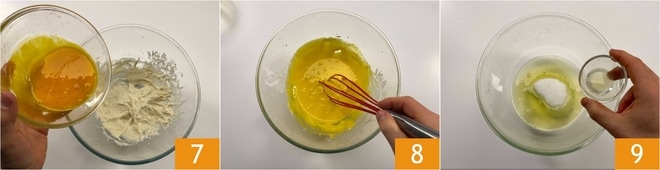 Por fim, despeje as gemas 7 e misture para incorporá-las 8. Em outra tigela, junte o açúcar às claras, depois despeje o suco de limão 9.