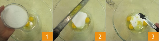 Para preparar o bolo sem leite, coloque em uma tigela os ovos e o açúcar 1, a casca de meio limão e as sementes da vagem de baunilha 3.