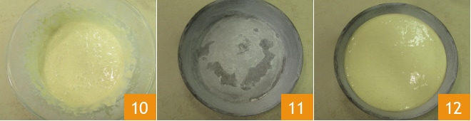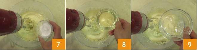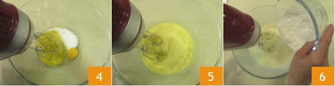 Com a batedeira elétrica, bata tudo em velocidade média 4 até obter um composto espumoso 5. Em seguida, adicione a farinha toda de uma vez 6 e continue a bater até ela ser absorvida.