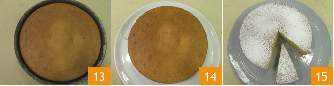 Faça o teste do palito antes de retirar do forno 13, deixe esfriar e desenforme o bolo sem leite 14. Polvilhe com açúcar de confeiteiro e sirva 15.