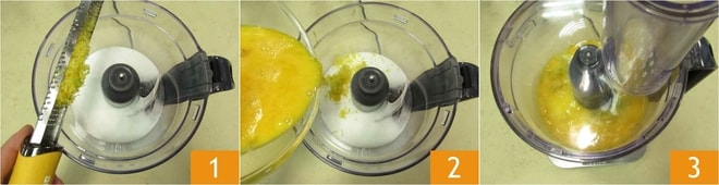Para preparar o bolo terai, a primeira coisa que você deve fazer é colocar dentro de um processador o açúcar e as raspas de limão, pegando apenas a parte amarela 1. Adicione os ovos 2 e ligue o processador na primeira velocidade 3. Não será necessário bater, mas apenas incorporar os ovos ao açúcar.