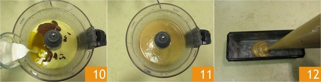 Adicione também o creme de leite fresco 10. Ligue rapidamente o processador até obter uma mistura homogênea 11. Transfira a mistura para um saco de confeitar e forre as forminhas com papel manteiga. Usando uma faca bem afiada, faça cortes nos cantos do papel, assim a forma final do doce será mais precisa e bem quadrada: com esta receita você obterá 3 bolos, então você precisará de 3 formas de 5x5x16 cm. Transfira 350 g de massa para cada forma 12.
