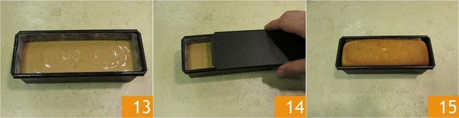 E continue da mesma forma para os outros dois 13. Cubra com a tampa apropriada 14 e asse em forno estático pré-aquecido a 175° por 35 minutos. Retire então o bolo do forno, abra a tampa com cuidado para não se queimar 15,