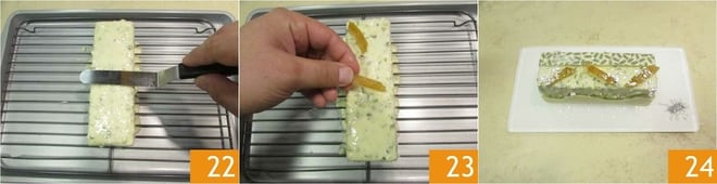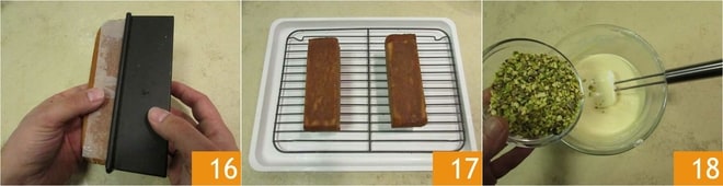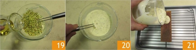 retire-o da forma 16 e vire-o sobre uma grade. Retire o papel manteiga e deixe esfriar completamente à temperatura ambiente 17, depois congele o bolo por pelo menos 2 horas. Pouco antes de cobri-lo, prepare a cobertura de chocolate. Coloque o chocolate branco em uma tigela e derreta no micro-ondas ou em banho-maria. Adicione os pedaços de pistache 18,