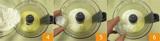 Em seguida, adicione a farinha previamente peneirada 4, o fermento em pó 5 e o sal 6.