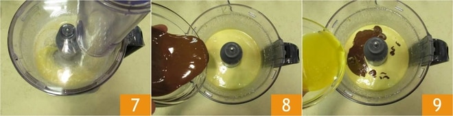 Misture tudo rapidamente 7, assim não se formará o glúten. Em seguida, adicione a pasta de avelã 8 e a manteiga clarificada, aquecida a 40° 9.