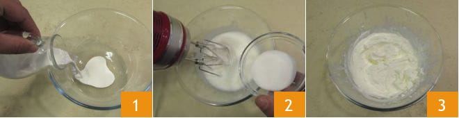Para preparar o bombardino, primeiro prepare o chantilly: coloque o creme de leite frio em uma tigela 1 e comece a bater com a batedeira elétrica enquanto adiciona gradualmente o açúcar 2 até obter uma consistência firme e sólida 3. Transfira o chantilly para um saco de confeitar com bico estrela.