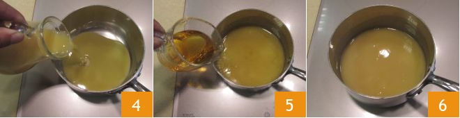 Agora coloque o Vov em uma panela pequena 4 e aqueça em fogo baixo por 5 minutos, depois adicione o conhaque 5 e desligue o fogo, girando ligeiramente a panela para misturar 6.