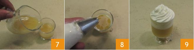 Encha os copos com o licor até cerca de dois terços 7, depois adicione o chantilly 8. Seu bombardino está pronto para ser apreciado 9!