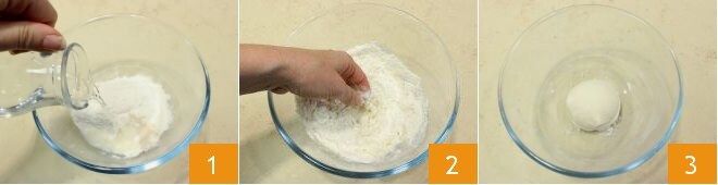Para preparar as bombas fritas, comece pela esponja: em uma tigela, coloque a farinha Manitoba peneirada, o fermento biológico seco e a água em temperatura ambiente 1. Você também pode usar o fermento biológico fresco: nesse caso, a quantidade é de 3 g. Trabalhe a mistura com as mãos 2 e forme uma bolinha 3 que você pode deixar fermentar no forno desligado com a luz acesa por 2 horas, coberta com filme plástico.