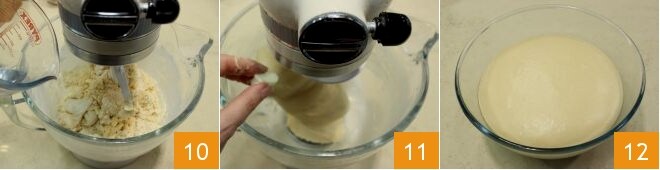 Adicione a água em temperatura ambiente 10 e, por último, o sal, e continue a trabalhar os ingredientes com a pá; quando a massa estiver bem homogênea, retire a pá e posicione o gancho. Depois amasse por cerca de 15 minutos, em seguida, adicione a manteiga amolecida em pedaços, pouco a pouco, esperando que o primeiro pedaço seja absorvido antes de continuar com o próximo 11. Quando tiver incorporado toda a manteiga, a massa estará lisa e homogênea, você pode parar a batedeira. Vire a massa sobre uma superfície de trabalho e forme uma bola, depois unte uma tigela levemente e coloque a massa dentro 12: cubra com filme plástico e deixe fermentar no forno desligado com a luz acesa por 2 horas (ou coberto com um cobertor de lã).