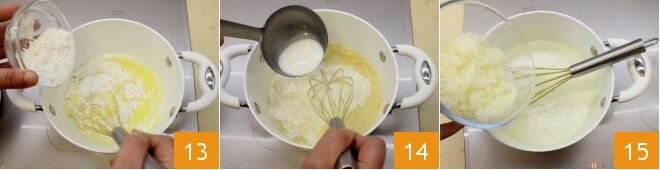 Enquanto a massa fermenta, prepare o Molho Mornay: rale o queijo Asiago curado, depois, em uma panela, derreta a manteiga em fogo baixo, em seguida, retire do fogo para adicionar a farinha aos poucos, mexendo com um fouet para evitar a formação de grumos 13. Coloque a panela de volta no fogo e toste a farinha por alguns instantes e, quando estiver dourada, adicione o leite em temperatura ambiente ou ligeiramente aquecido 14. Mexa continuamente, ajuste o sal e aromatize com uma pitada de noz-moscada. Depois, uma vez atingida a fervura, retire do fogo e adicione o queijo Asiago ralado 15.