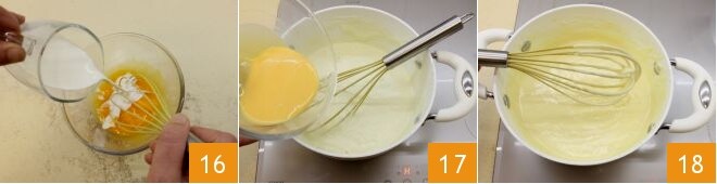 Em uma tigelinha à parte, bata as gemas com o creme de leite fresco líquido 16, depois adicione à bechamel 17 e misture para incorporar os ingredientes 18 (se necessário, você pode voltar o molho ao fogo para engrossá-lo mais). Uma vez pronto, despeje o molho em uma assadeira baixa e larga e cubra com filme plástico em contato para esfriar em temperatura ambiente, depois coloque na geladeira.