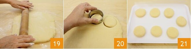 Passado o tempo necessário, retome a massa e estenda-a sobre uma superfície de trabalho ligeiramente enfarinhada em um retângulo com cerca de 2,5 cm de espessura 19. Com um cortador de 6,5 cm de diâmetro, corte os discos 20; você poderá amassar novamente os retalhos e deixar a massa fermentar por cerca de 30 minutos antes de realizar outras formas: à medida que realiza os discos, coloque-os em uma bandeja forrada com papel manteiga 21: com essas quantidades, você obterá 24 discos. Deixe-os fermentar por cerca de meia hora no forno desligado com a luz acesa.