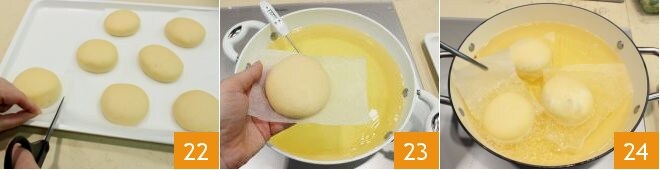 Depois, corte um quadrado de papel manteiga ao redor de cada disco 22 e frite poucos discos por vez em bastante óleo de amendoim 23, aquecido a uma temperatura máxima de 175-180° (você pode medir com um termômetro de cozinha). Uma vez colocados os discos no óleo, retire o papel manteiga com uma pinça de cozinha 24