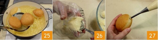 e vire as bombas de vez em quando para dourá-las e inflá-las uniformemente. Quando estiverem douradas, escorra com uma escumadeira 25 e coloque em uma bandeja forrada com papel absorvente. Enquanto as bombas esfriam ligeiramente, coloque o molho Mornay em um saco de confeiteiro com bico de seringa 26, depois recheie uma a uma as bombas fritas salgadas com o molho 27 e sirva ainda quentes ou levemente aquecidas no forno!