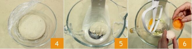 Após duas horas, a esponja terá dobrado de volume 4, então coloque-a na tigela de uma batedeira 5 (ou em uma tigela se amassar à mão) equipada com pá e adicione os ovos 6