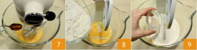 Adicione o malte (ou o açúcar) 7, depois, aos poucos, a farinha peneirada 8, o fermento biológico seco 9 e o químico para preparações salgadas. Quanto ao fermento biológico, se usar o fresco a quantidade é de 9 g. Ligue a batedeira