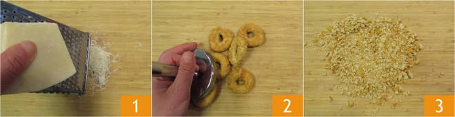 Para preparar as bombinhas de frango cacio e pepe comece ralando o pecorino 1. Agora, esmague os taralli com um batedor de carne grosseiramente 2 para reduzi-los em migalhas e reserve 3.