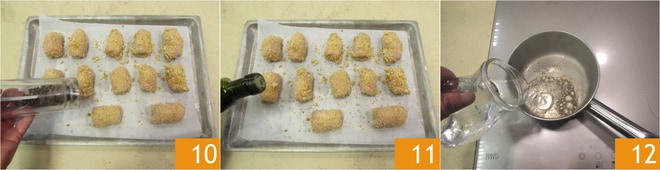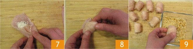 Dobre as bordas laterais para dentro 7 e enrole a fatia para criar o rolinho 8. Com essas quantidades, você obterá 12. Passe os rolinhos nos taralli triturados 9.