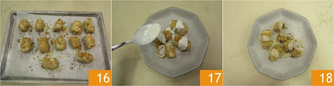 Uma vez cozidas as bombinhas de frango cacio e pepe 16, retire-as do forno e sirva-as bem quentes com o molho de pecorino 17 18.